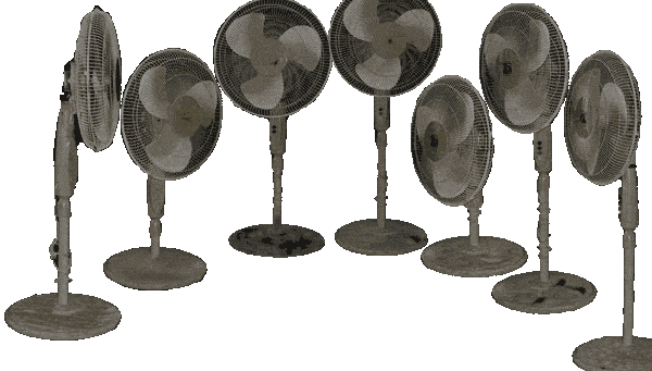 A webcam located above the installation space relays video via a USB link to a computer in another room. The software looks for objects of interest -- i.e., people -- in the visual field and calculates the angle through which each fan must move in order to face directly toward a person. The software can handle multiple people: each fan turns toward the closest person. The software is blind to the fans themselves, although during an early test this part of the code malfunctioned and two fans saw each other as objects of interest, with hilarious results.
